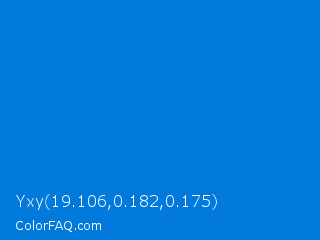 Yxy 19.106,0.182,0.175 Color is a normal blue color and the nearest color is True Blue #0073cf. Hex code #017adc and RGB value is rgb(1,122,220). In RGB color space, this color is composed of 0% red, 48% green, 86% blue, In CMYK color space, this color is composed of 100% cyan, 45% magenta, 0% yellow , 14% black , In HSL color space, this color has a hue angle of 207° , 99% saturation and 43% lightness.