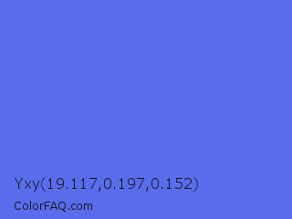 Yxy 19.117,0.197,0.152 Color is a light blue color and the nearest color is Very Light Blue #6666ff. Hex code #596dec and RGB value is rgb(89,109,236). In RGB color space, this color is composed of 35% red, 43% green, 93% blue, In CMYK color space, this color is composed of 62% cyan, 54% magenta, 0% yellow , 7% black , In HSL color space, this color has a hue angle of 232° , 79% saturation and 64% lightness.