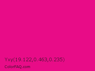 Yxy 19.122,0.463,0.235 Color is a normal magenta color and the nearest color is Mexican Pink #e4007c. Hex code #e80c87 and RGB value is rgb(232,12,135). In RGB color space, this color is composed of 91% red, 5% green, 53% blue, In CMYK color space, this color is composed of 0% cyan, 95% magenta, 42% yellow , 9% black , In HSL color space, this color has a hue angle of 326° , 90% saturation and 48% lightness.