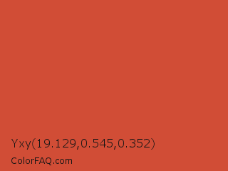 Yxy 19.129,0.545,0.352 Color is a normal red color and the nearest color is Valencia #d84437. Hex code #d14d36 and RGB value is rgb(209,77,54). In RGB color space, this color is composed of 82% red, 30% green, 21% blue, In CMYK color space, this color is composed of 0% cyan, 63% magenta, 74% yellow , 18% black , In HSL color space, this color has a hue angle of 9° , 63% saturation and 52% lightness.