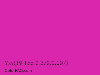 Yxy 19.155,0.379,0.197 Color is a normal magenta color and the nearest color is Frostbite #e936a7. Hex code #d926ad and RGB value is rgb(217,38,173). In RGB color space, this color is composed of 85% red, 15% green, 68% blue, In CMYK color space, this color is composed of 0% cyan, 82% magenta, 20% yellow , 15% black , In HSL color space, this color has a hue angle of 315° , 70% saturation and 50% lightness.