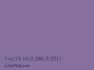 Yxy 19.16,0.286,0.251 Color is a normal violet color and the nearest color is Trendy Pink #8c6495. Hex code #86709f and RGB value is rgb(134,112,159). In RGB color space, this color is composed of 53% red, 44% green, 62% blue, In CMYK color space, this color is composed of 16% cyan, 30% magenta, 0% yellow , 38% black , In HSL color space, this color has a hue angle of 268° , 20% saturation and 53% lightness.