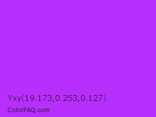 Yxy 19.173,0.253,0.127 Color is a normal purple color and the nearest color is Veronica #a020f0. Hex code #b72ffc and RGB value is rgb(183,47,252). In RGB color space, this color is composed of 72% red, 18% green, 99% blue, In CMYK color space, this color is composed of 27% cyan, 81% magenta, 0% yellow , 1% black , In HSL color space, this color has a hue angle of 280° , 97% saturation and 59% lightness.