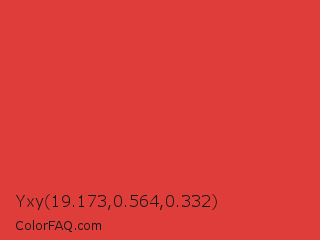 Yxy 19.173,0.564,0.332 Color is a normal red color and the nearest color is Jasper #d73b3e. Hex code #de3d3a and RGB value is rgb(222,61,58). In RGB color space, this color is composed of 87% red, 24% green, 23% blue, In CMYK color space, this color is composed of 0% cyan, 73% magenta, 74% yellow , 13% black , In HSL color space, this color has a hue angle of 1° , 71% saturation and 55% lightness.