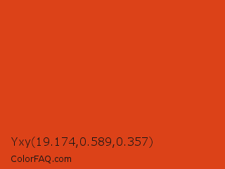 Yxy 19.174,0.589,0.357 Color is a normal red color and the nearest color is Vermilion #d9381e. Hex code #dc4218 and RGB value is rgb(220,66,24). In RGB color space, this color is composed of 86% red, 26% green, 9% blue, In CMYK color space, this color is composed of 0% cyan, 70% magenta, 89% yellow , 14% black , In HSL color space, this color has a hue angle of 13° , 80% saturation and 48% lightness.
