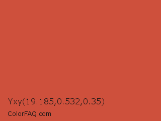 Yxy 19.185,0.532,0.35 Color is a normal red color and the nearest color is Dark Coral #cd5b45. Hex code #ce503c and RGB value is rgb(206,80,60). In RGB color space, this color is composed of 81% red, 31% green, 24% blue, In CMYK color space, this color is composed of 0% cyan, 61% magenta, 71% yellow , 19% black , In HSL color space, this color has a hue angle of 8° , 60% saturation and 52% lightness.