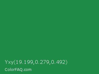 Yxy 19.199,0.279,0.492 Color is a normal green color and the nearest color is Eucalyptus #278a5b. Hex code #1e8b46 and RGB value is rgb(30,139,70). In RGB color space, this color is composed of 12% red, 55% green, 27% blue, In CMYK color space, this color is composed of 78% cyan, 0% magenta, 50% yellow , 45% black , In HSL color space, this color has a hue angle of 142° , 64% saturation and 33% lightness.