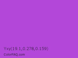 Yxy 19.1,0.278,0.159 Color is a normal purple color and the nearest color is Medium Orchid #ba55d3. Hex code #b347d9 and RGB value is rgb(179,71,217). In RGB color space, this color is composed of 70% red, 28% green, 85% blue, In CMYK color space, this color is composed of 18% cyan, 67% magenta, 0% yellow , 15% black , In HSL color space, this color has a hue angle of 284° , 66% saturation and 56% lightness.