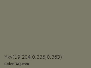 Yxy 19.204,0.336,0.363 Color is a normal yellow color and the nearest color is Flax Smoke #7b8265. Hex code #7c7a68 and RGB value is rgb(124,122,104). In RGB color space, this color is composed of 49% red, 48% green, 41% blue, In CMYK color space, this color is composed of 0% cyan, 2% magenta, 16% yellow , 51% black , In HSL color space, this color has a hue angle of 54° , 9% saturation and 45% lightness.