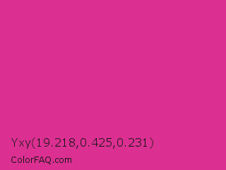 Yxy 19.218,0.425,0.231 Color is a normal magenta color and the nearest color is Cerise #da3287. Hex code #db3091 and RGB value is rgb(219,48,145). In RGB color space, this color is composed of 86% red, 19% green, 57% blue, In CMYK color space, this color is composed of 0% cyan, 78% magenta, 34% yellow , 14% black , In HSL color space, this color has a hue angle of 326° , 70% saturation and 52% lightness.