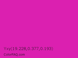 Yxy 19.228,0.377,0.193 Color is a normal magenta color and the nearest color is Frostbite #e936a7. Hex code #db20b0 and RGB value is rgb(219,32,176). In RGB color space, this color is composed of 86% red, 13% green, 69% blue, In CMYK color space, this color is composed of 0% cyan, 85% magenta, 20% yellow , 14% black , In HSL color space, this color has a hue angle of 314° , 75% saturation and 49% lightness.