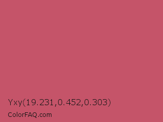 Yxy 19.231,0.452,0.303 Color is a normal red color and the nearest color is Popstar #be4f62. Hex code #c55469 and RGB value is rgb(197,84,105). In RGB color space, this color is composed of 77% red, 33% green, 41% blue, In CMYK color space, this color is composed of 0% cyan, 57% magenta, 47% yellow , 23% black , In HSL color space, this color has a hue angle of 349° , 49% saturation and 55% lightness.
