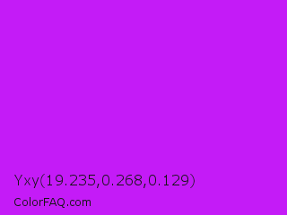 Yxy 19.235,0.268,0.129 Color is a normal purple color and the nearest color is Vivid Mulberry #b80ce3. Hex code #c41bf7 and RGB value is rgb(196,27,247). In RGB color space, this color is composed of 77% red, 11% green, 97% blue, In CMYK color space, this color is composed of 21% cyan, 89% magenta, 0% yellow , 3% black , In HSL color space, this color has a hue angle of 286° , 93% saturation and 54% lightness.
