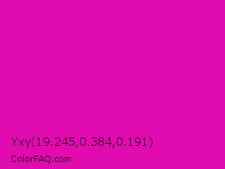 Yxy 19.245,0.384,0.191 Color is a normal magenta color and the nearest color is Hollywood Cerise #f400a1. Hex code #e00cb0 and RGB value is rgb(224,12,176). In RGB color space, this color is composed of 88% red, 5% green, 69% blue, In CMYK color space, this color is composed of 0% cyan, 95% magenta, 21% yellow , 12% black , In HSL color space, this color has a hue angle of 314° , 90% saturation and 46% lightness.