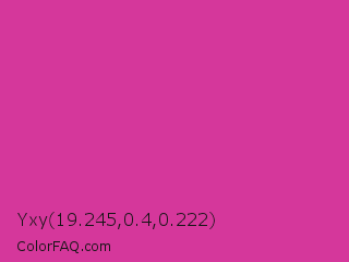 Yxy 19.245,0.4,0.222 Color is a normal magenta color and the nearest color is Royal Fuchsia #ca2c92. Hex code #d5379b and RGB value is rgb(213,55,155). In RGB color space, this color is composed of 84% red, 22% green, 61% blue, In CMYK color space, this color is composed of 0% cyan, 74% magenta, 27% yellow , 16% black , In HSL color space, this color has a hue angle of 322° , 65% saturation and 53% lightness.