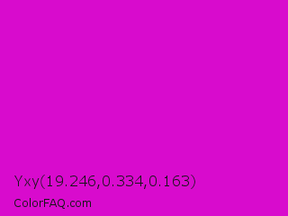 Yxy 19.246,0.334,0.163 Color is a normal magenta color and the nearest color is Deep Magenta #cc00cc. Hex code #d80bcd and RGB value is rgb(216,11,205). In RGB color space, this color is composed of 85% red, 4% green, 80% blue, In CMYK color space, this color is composed of 0% cyan, 95% magenta, 5% yellow , 15% black , In HSL color space, this color has a hue angle of 303° , 90% saturation and 45% lightness.