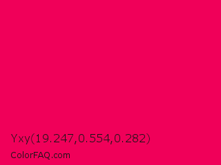 Yxy 19.247,0.554,0.282 Color is a normal rose color and the nearest color is Razzmatazz Crayola #e30b5c. Hex code #f00059 and RGB value is rgb(240,0,89). In RGB color space, this color is composed of 94% red, 0% green, 35% blue, In CMYK color space, this color is composed of 0% cyan, 100% magenta, 63% yellow , 6% black , In HSL color space, this color has a hue angle of 338° , 100% saturation and 47% lightness.