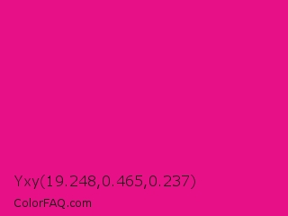 Yxy 19.248,0.465,0.237 Color is a normal magenta color and the nearest color is Barbie Pink #e0218a. Hex code #e81086 and RGB value is rgb(232,16,134). In RGB color space, this color is composed of 91% red, 6% green, 53% blue, In CMYK color space, this color is composed of 0% cyan, 93% magenta, 42% yellow , 9% black , In HSL color space, this color has a hue angle of 327° , 87% saturation and 49% lightness.
