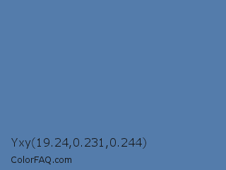 Yxy 19.24,0.231,0.244 Color is a normal blue color and the nearest color is Blue Yonder #5072a7. Hex code #547cab and RGB value is rgb(84,124,171). In RGB color space, this color is composed of 33% red, 49% green, 67% blue, In CMYK color space, this color is composed of 51% cyan, 27% magenta, 0% yellow , 33% black , In HSL color space, this color has a hue angle of 212° , 34% saturation and 50% lightness.