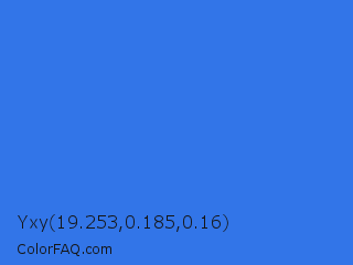 Yxy 19.253,0.185,0.16 Color is a normal blue color and the nearest color is Royal Blue #4169e1. Hex code #3275e8 and RGB value is rgb(50,117,232). In RGB color space, this color is composed of 20% red, 46% green, 91% blue, In CMYK color space, this color is composed of 78% cyan, 50% magenta, 0% yellow , 9% black , In HSL color space, this color has a hue angle of 218° , 80% saturation and 55% lightness.