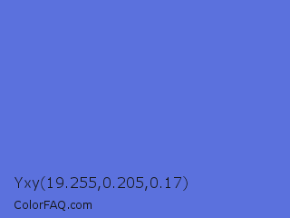 Yxy 19.255,0.205,0.17 Color is a light blue color and the nearest color is Indigo #4f69c6. Hex code #5b71dd and RGB value is rgb(91,113,221). In RGB color space, this color is composed of 36% red, 44% green, 87% blue, In CMYK color space, this color is composed of 59% cyan, 49% magenta, 0% yellow , 13% black , In HSL color space, this color has a hue angle of 230° , 66% saturation and 61% lightness.