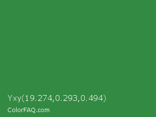 Yxy 19.274,0.293,0.494 Color is a normal green color and the nearest color is Sea Green #2e8b57. Hex code #338a42 and RGB value is rgb(51,138,66). In RGB color space, this color is composed of 20% red, 54% green, 26% blue, In CMYK color space, this color is composed of 63% cyan, 0% magenta, 52% yellow , 46% black , In HSL color space, this color has a hue angle of 130° , 46% saturation and 37% lightness.