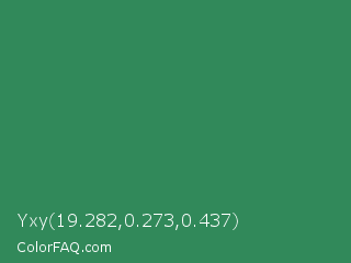 Yxy 19.282,0.273,0.437 Color is a normal green color and the nearest color is Sea Green #2e8b57. Hex code #31895a and RGB value is rgb(49,137,90). In RGB color space, this color is composed of 19% red, 54% green, 35% blue, In CMYK color space, this color is composed of 64% cyan, 0% magenta, 34% yellow , 46% black , In HSL color space, this color has a hue angle of 148° , 47% saturation and 36% lightness.