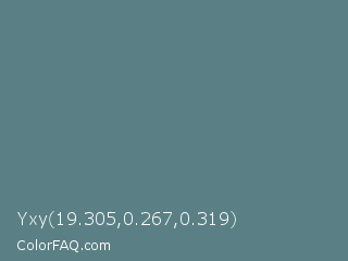 Yxy 19.305,0.267,0.319 Color is a normal cyan color and the nearest color is Wintergreen Dream #56887d. Hex code #5a8085 and RGB value is rgb(90,128,133). In RGB color space, this color is composed of 35% red, 50% green, 52% blue, In CMYK color space, this color is composed of 32% cyan, 4% magenta, 0% yellow , 48% black , In HSL color space, this color has a hue angle of 187° , 19% saturation and 44% lightness.