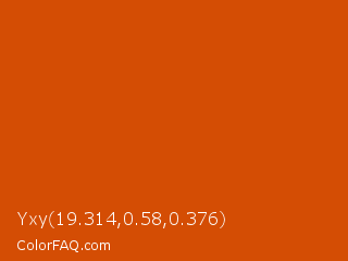 Yxy 19.314,0.58,0.376 Color is a normal orange color and the nearest color is Grenadier #d54600. Hex code #d44d04 and RGB value is rgb(212,77,4). In RGB color space, this color is composed of 83% red, 30% green, 2% blue, In CMYK color space, this color is composed of 0% cyan, 64% magenta, 98% yellow , 17% black , In HSL color space, this color has a hue angle of 21° , 96% saturation and 42% lightness.