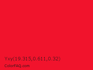 Yxy 19.315,0.611,0.32 Color is a normal red color and the nearest color is Red Pigment #ed1c24. Hex code #f1132c and RGB value is rgb(241,19,44). In RGB color space, this color is composed of 95% red, 7% green, 17% blue, In CMYK color space, this color is composed of 0% cyan, 92% magenta, 82% yellow , 5% black , In HSL color space, this color has a hue angle of 353° , 89% saturation and 51% lightness.