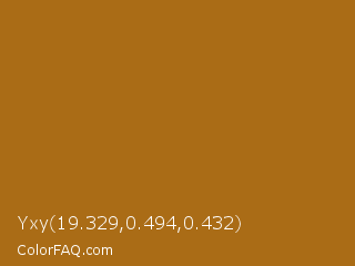 Yxy 19.329,0.494,0.432 Color is a normal orange color and the nearest color is Reno Sand #a86515. Hex code #aa6c16 and RGB value is rgb(170,108,22). In RGB color space, this color is composed of 67% red, 42% green, 9% blue, In CMYK color space, this color is composed of 0% cyan, 36% magenta, 87% yellow , 33% black , In HSL color space, this color has a hue angle of 35° , 77% saturation and 38% lightness.