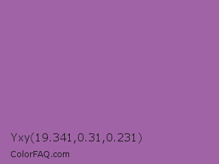 Yxy 19.341,0.31,0.231 Color is a normal magenta color and the nearest color is Wisteria #9771b5. Hex code #a064a6 and RGB value is rgb(160,100,166). In RGB color space, this color is composed of 63% red, 39% green, 65% blue, In CMYK color space, this color is composed of 4% cyan, 40% magenta, 0% yellow , 35% black , In HSL color space, this color has a hue angle of 295° , 27% saturation and 52% lightness.