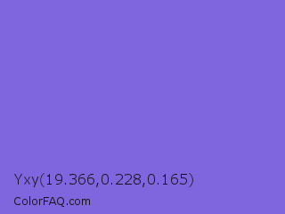 Yxy 19.366,0.228,0.165 Color is a light indigo color and the nearest color is Medium Slate Blue #7b68ee. Hex code #8066de and RGB value is rgb(128,102,222). In RGB color space, this color is composed of 50% red, 40% green, 87% blue, In CMYK color space, this color is composed of 42% cyan, 54% magenta, 0% yellow , 13% black , In HSL color space, this color has a hue angle of 253° , 65% saturation and 64% lightness.