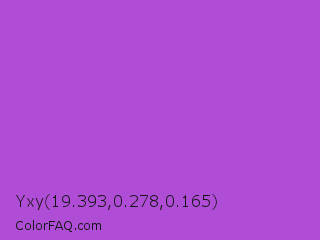 Yxy 19.393,0.278,0.165 Color is a normal purple color and the nearest color is Medium Orchid #ba55d3. Hex code #b04dd6 and RGB value is rgb(176,77,214). In RGB color space, this color is composed of 69% red, 30% green, 84% blue, In CMYK color space, this color is composed of 18% cyan, 64% magenta, 0% yellow , 16% black , In HSL color space, this color has a hue angle of 283° , 63% saturation and 57% lightness.