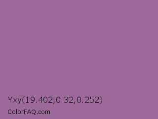 Yxy 19.402,0.32,0.252 Color is a normal magenta color and the nearest color is Trendy Pink #8c6495. Hex code #9d689a and RGB value is rgb(157,104,154). In RGB color space, this color is composed of 62% red, 41% green, 60% blue, In CMYK color space, this color is composed of 0% cyan, 34% magenta, 2% yellow , 38% black , In HSL color space, this color has a hue angle of 303° , 21% saturation and 51% lightness.