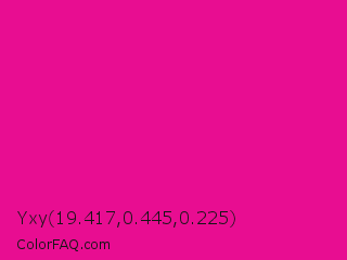 Yxy 19.417,0.445,0.225 Color is a normal magenta color and the nearest color is Barbie Pink #e0218a. Hex code #e80d91 and RGB value is rgb(232,13,145). In RGB color space, this color is composed of 91% red, 5% green, 57% blue, In CMYK color space, this color is composed of 0% cyan, 94% magenta, 38% yellow , 9% black , In HSL color space, this color has a hue angle of 324° , 89% saturation and 48% lightness.