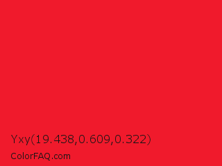 Yxy 19.438,0.609,0.322 Color is a normal red color and the nearest color is Red Pigment #ed1c24. Hex code #f01a2c and RGB value is rgb(240,26,44). In RGB color space, this color is composed of 94% red, 10% green, 17% blue, In CMYK color space, this color is composed of 0% cyan, 89% magenta, 82% yellow , 6% black , In HSL color space, this color has a hue angle of 355° , 88% saturation and 52% lightness.