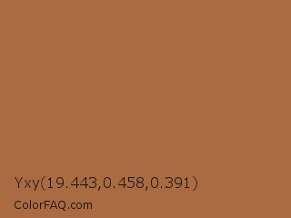 Yxy 19.443,0.458,0.391 Color is a normal orange color and the nearest color is Cape Palliser #a26645. Hex code #aa6b41 and RGB value is rgb(170,107,65). In RGB color space, this color is composed of 67% red, 42% green, 25% blue, In CMYK color space, this color is composed of 0% cyan, 37% magenta, 62% yellow , 33% black , In HSL color space, this color has a hue angle of 24° , 45% saturation and 46% lightness.