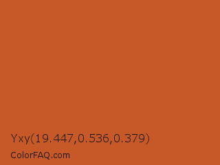 Yxy 19.447,0.536,0.379 Color is a normal orange color and the nearest color is Piper #c96323. Hex code #c75929 and RGB value is rgb(199,89,41). In RGB color space, this color is composed of 78% red, 35% green, 16% blue, In CMYK color space, this color is composed of 0% cyan, 55% magenta, 79% yellow , 22% black , In HSL color space, this color has a hue angle of 18° , 66% saturation and 47% lightness.