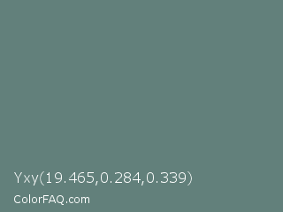 Yxy 19.465,0.284,0.339 Color is a normal cyan color and the nearest color is Viridian Green #678975. Hex code #62807b and RGB value is rgb(98,128,123). In RGB color space, this color is composed of 38% red, 50% green, 48% blue, In CMYK color space, this color is composed of 23% cyan, 0% magenta, 4% yellow , 50% black , In HSL color space, this color has a hue angle of 170° , 13% saturation and 44% lightness.
