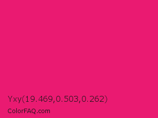 Yxy 19.469,0.503,0.262 Color is a normal rose color and the nearest color is Razzmatazz #e3256b. Hex code #ea1a71 and RGB value is rgb(234,26,113). In RGB color space, this color is composed of 92% red, 10% green, 44% blue, In CMYK color space, this color is composed of 0% cyan, 89% magenta, 52% yellow , 8% black , In HSL color space, this color has a hue angle of 335° , 83% saturation and 51% lightness.