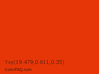 Yxy 19.479,0.611,0.35 Color is a normal red color and the nearest color is Trinidad #e64e03. Hex code #e63607 and RGB value is rgb(230,54,7). In RGB color space, this color is composed of 90% red, 21% green, 3% blue, In CMYK color space, this color is composed of 0% cyan, 77% magenta, 97% yellow , 10% black , In HSL color space, this color has a hue angle of 13° , 94% saturation and 46% lightness.
