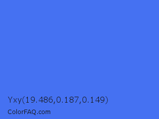 Yxy 19.486,0.187,0.149 Color is a light blue color and the nearest color is Ultramarine Blue #4166f5. Hex code #4571f2 and RGB value is rgb(69,113,242). In RGB color space, this color is composed of 27% red, 44% green, 95% blue, In CMYK color space, this color is composed of 71% cyan, 53% magenta, 0% yellow , 5% black , In HSL color space, this color has a hue angle of 225° , 87% saturation and 61% lightness.