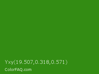 Yxy 19.507,0.318,0.571 Color is a normal green color and the nearest color is La Palma #368716. Hex code #338c13 and RGB value is rgb(51,140,19). In RGB color space, this color is composed of 20% red, 55% green, 7% blue, In CMYK color space, this color is composed of 64% cyan, 0% magenta, 86% yellow , 45% black , In HSL color space, this color has a hue angle of 104° , 76% saturation and 31% lightness.