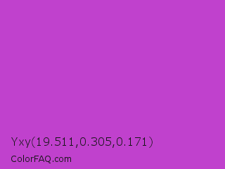 Yxy 19.511,0.305,0.171 Color is a normal magenta color and the nearest color is Steel Pink #cc33cc. Hex code #c041cd and RGB value is rgb(192,65,205). In RGB color space, this color is composed of 75% red, 25% green, 80% blue, In CMYK color space, this color is composed of 6% cyan, 68% magenta, 0% yellow , 20% black , In HSL color space, this color has a hue angle of 294° , 58% saturation and 53% lightness.