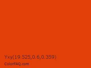 Yxy 19.525,0.6,0.359 Color is a normal orange color and the nearest color is Grenadier #d54600. Hex code #e04006 and RGB value is rgb(224,64,6). In RGB color space, this color is composed of 88% red, 25% green, 2% blue, In CMYK color space, this color is composed of 0% cyan, 71% magenta, 97% yellow , 12% black , In HSL color space, this color has a hue angle of 16° , 95% saturation and 45% lightness.