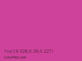 Yxy 19.528,0.39,0.227 Color is a normal magenta color and the nearest color is Pink Pantone #d74894. Hex code #cf429b and RGB value is rgb(207,66,155). In RGB color space, this color is composed of 81% red, 26% green, 61% blue, In CMYK color space, this color is composed of 0% cyan, 68% magenta, 25% yellow , 19% black , In HSL color space, this color has a hue angle of 322° , 59% saturation and 54% lightness.
