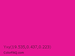 Yxy 19.535,0.437,0.223 Color is a normal magenta color and the nearest color is Barbie Pink #e0218a. Hex code #e61694 and RGB value is rgb(230,22,148). In RGB color space, this color is composed of 90% red, 9% green, 58% blue, In CMYK color space, this color is composed of 0% cyan, 90% magenta, 36% yellow , 10% black , In HSL color space, this color has a hue angle of 324° , 83% saturation and 49% lightness.