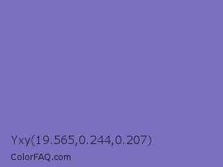 Yxy 19.565,0.244,0.207 Color is a normal indigo color and the nearest color is Toolbox #746cc0. Hex code #7871bf and RGB value is rgb(120,113,191). In RGB color space, this color is composed of 47% red, 44% green, 75% blue, In CMYK color space, this color is composed of 37% cyan, 41% magenta, 0% yellow , 25% black , In HSL color space, this color has a hue angle of 245° , 38% saturation and 60% lightness.