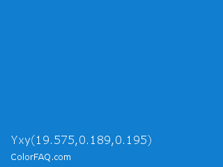 Yxy 19.575,0.189,0.195 Color is a normal blue color and the nearest color is Bright Navy Blue #1974d2. Hex code #117ecf and RGB value is rgb(17,126,207). In RGB color space, this color is composed of 7% red, 49% green, 81% blue, In CMYK color space, this color is composed of 92% cyan, 39% magenta, 0% yellow , 19% black , In HSL color space, this color has a hue angle of 206° , 85% saturation and 44% lightness.